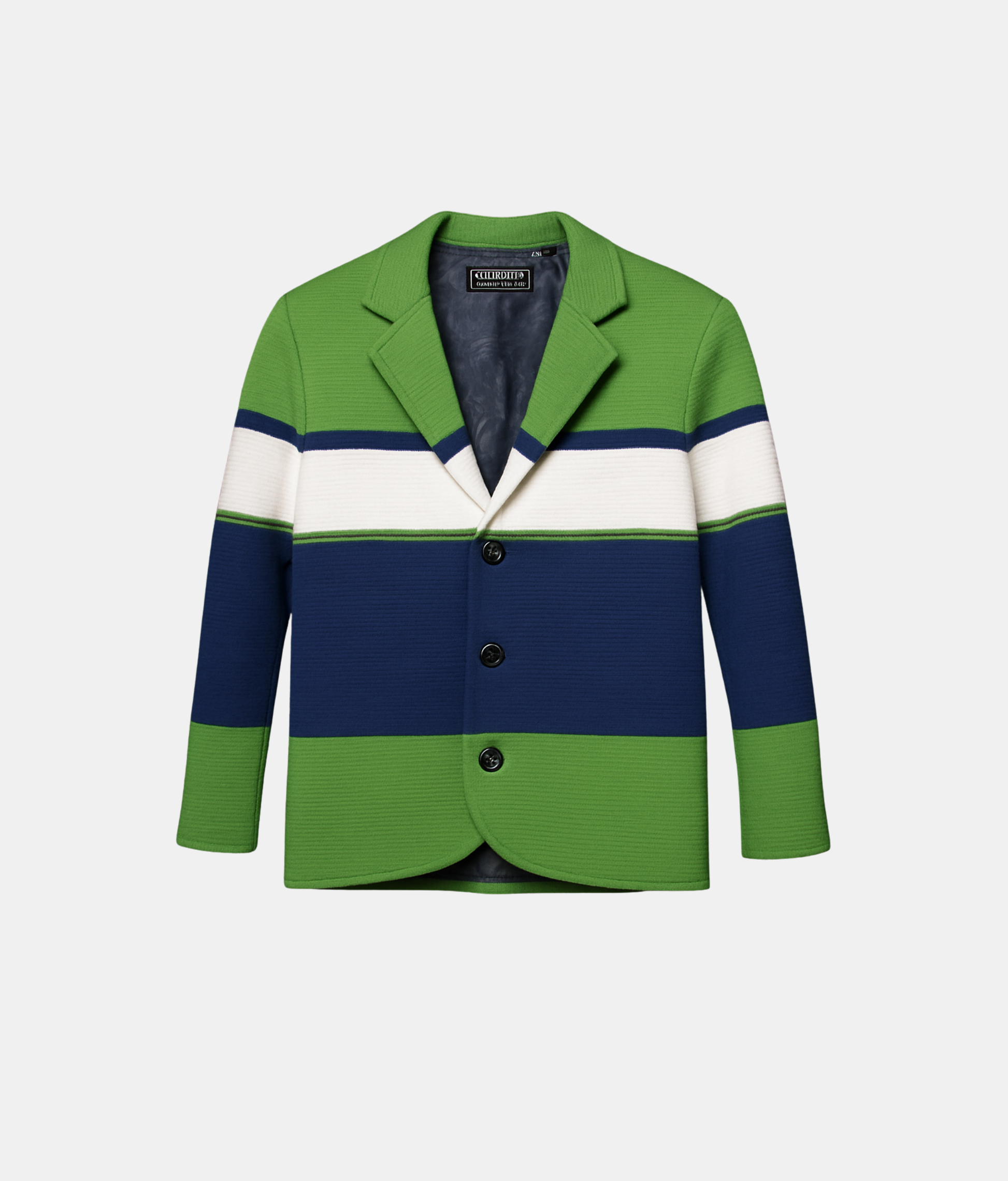 Stylish and modern, this green and blue striped boys blazer features bold horizontal color-blocking and a smart notch collar. Perfect for formal occasions or stylish outings.