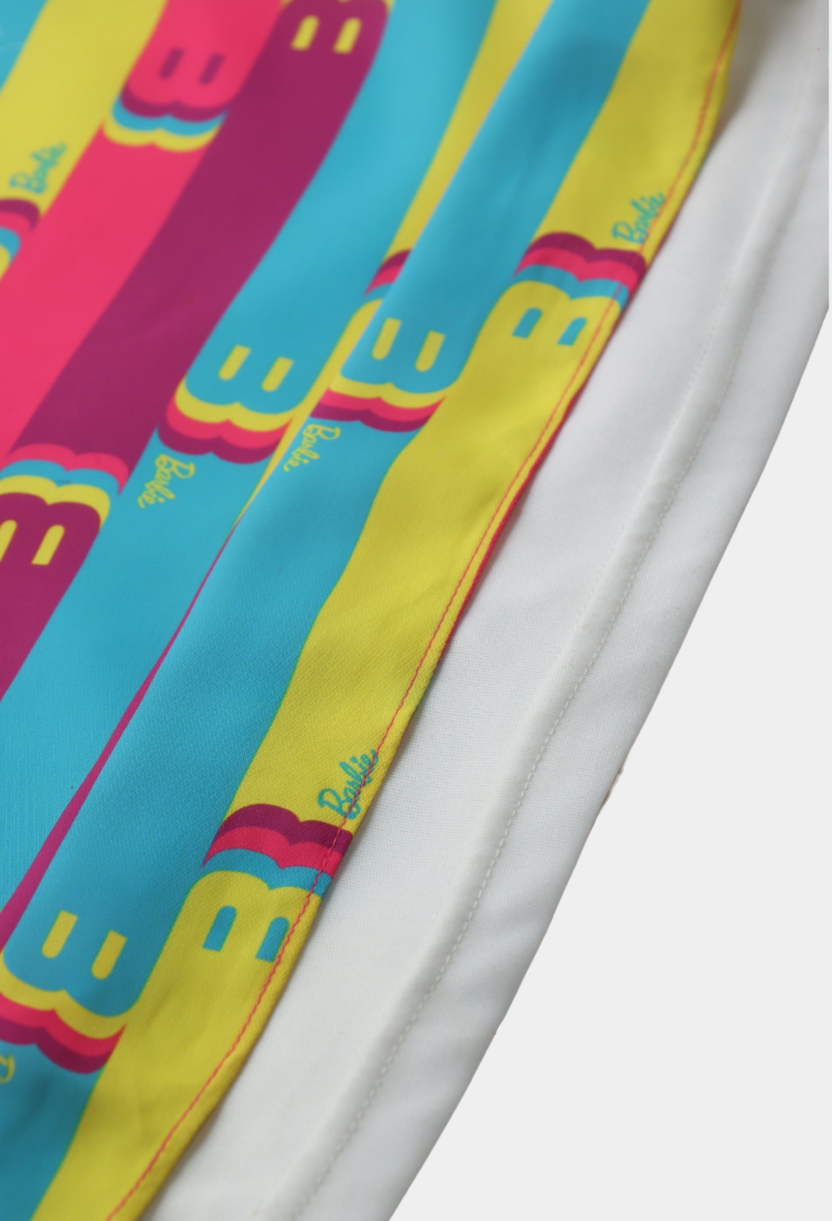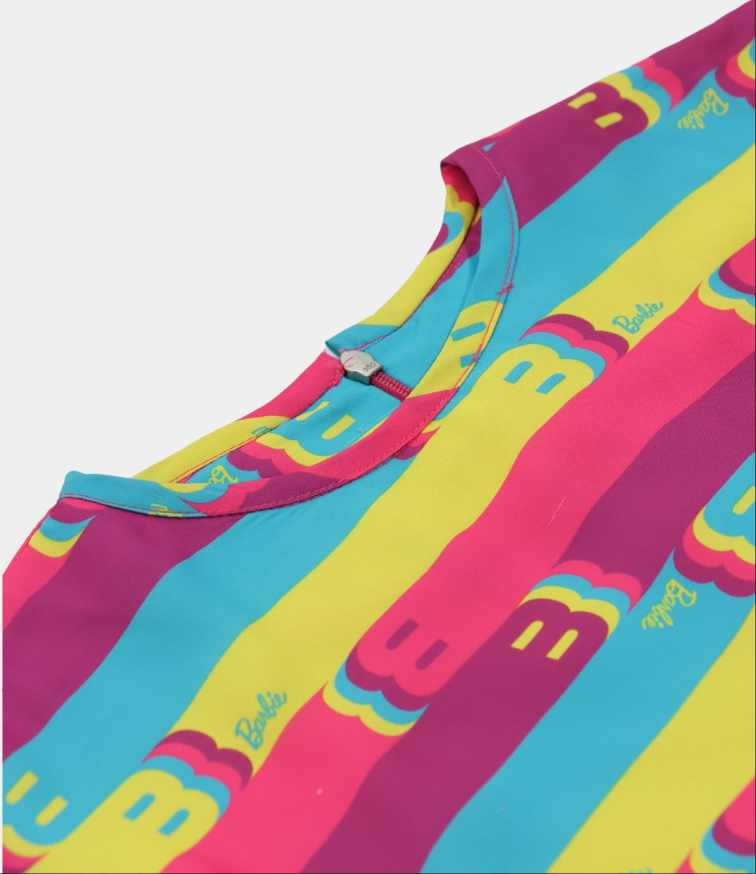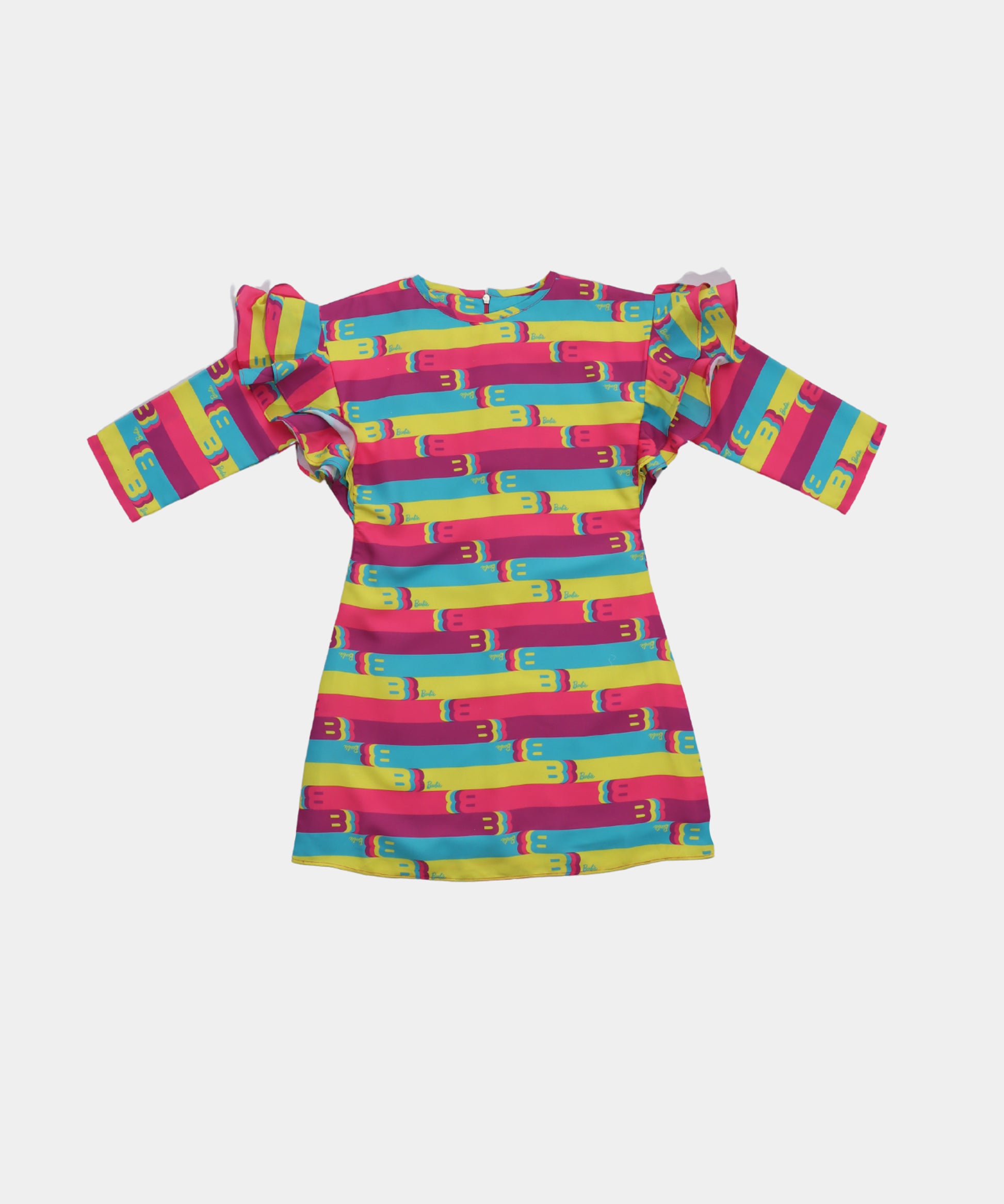 Bright, bold, and Barbie-approved! This multicolor girls dress features iconic Barbie prints, playful ruffle sleeves, and a comfy fit—perfect for little fashionistas who love to stand out.
