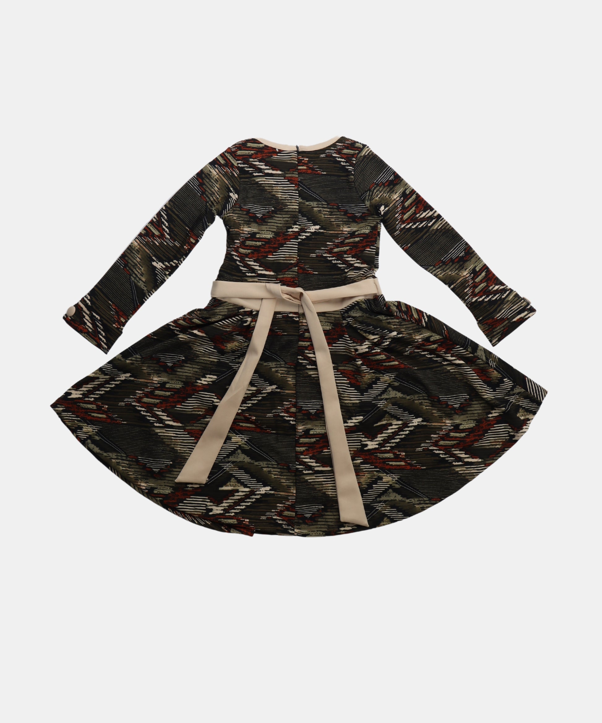 This full-sleeve frock in rich brown abstract print with contrast piping and side buttons brings comfort and elegance to everyday dressing. Ideal for both casual wear and small gatherings.