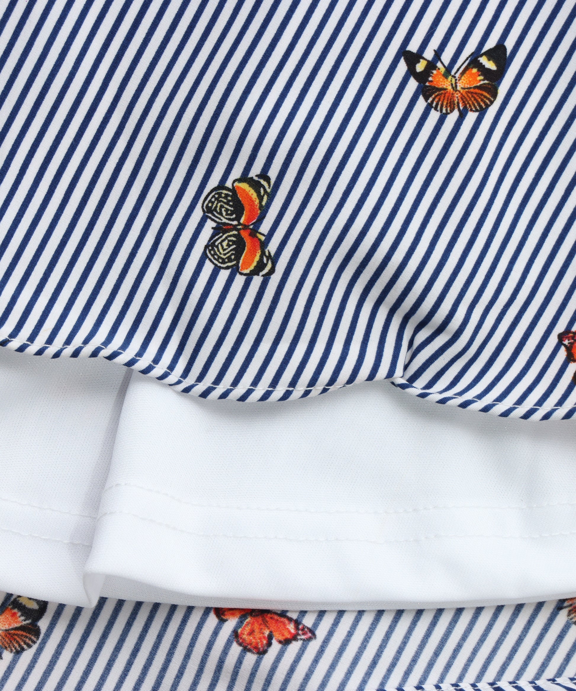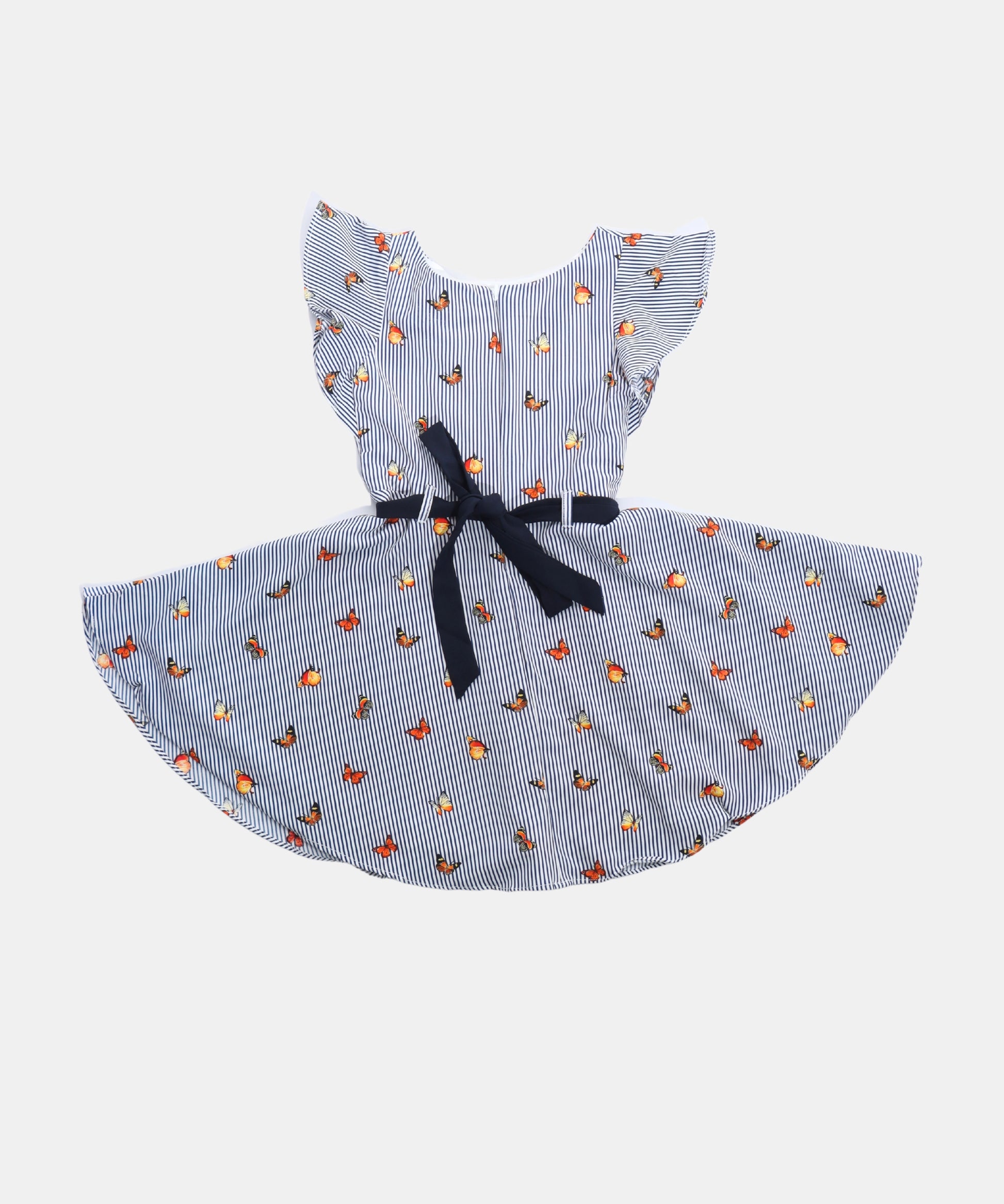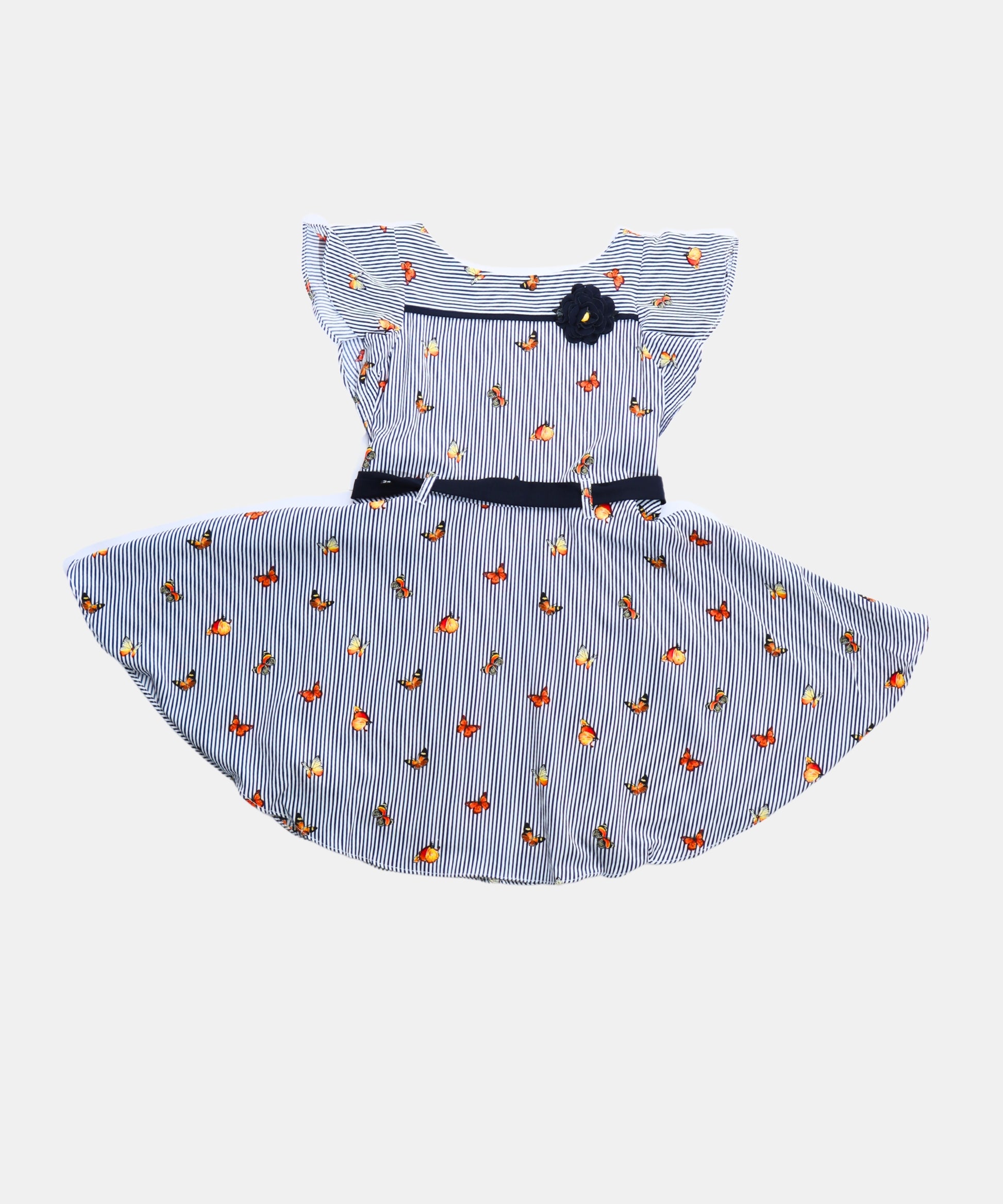Chic navy and white striped frock with playful floral prints and flutter sleeves, finished with a cute waistbelt and bow—perfect for everyday wear or outings.
