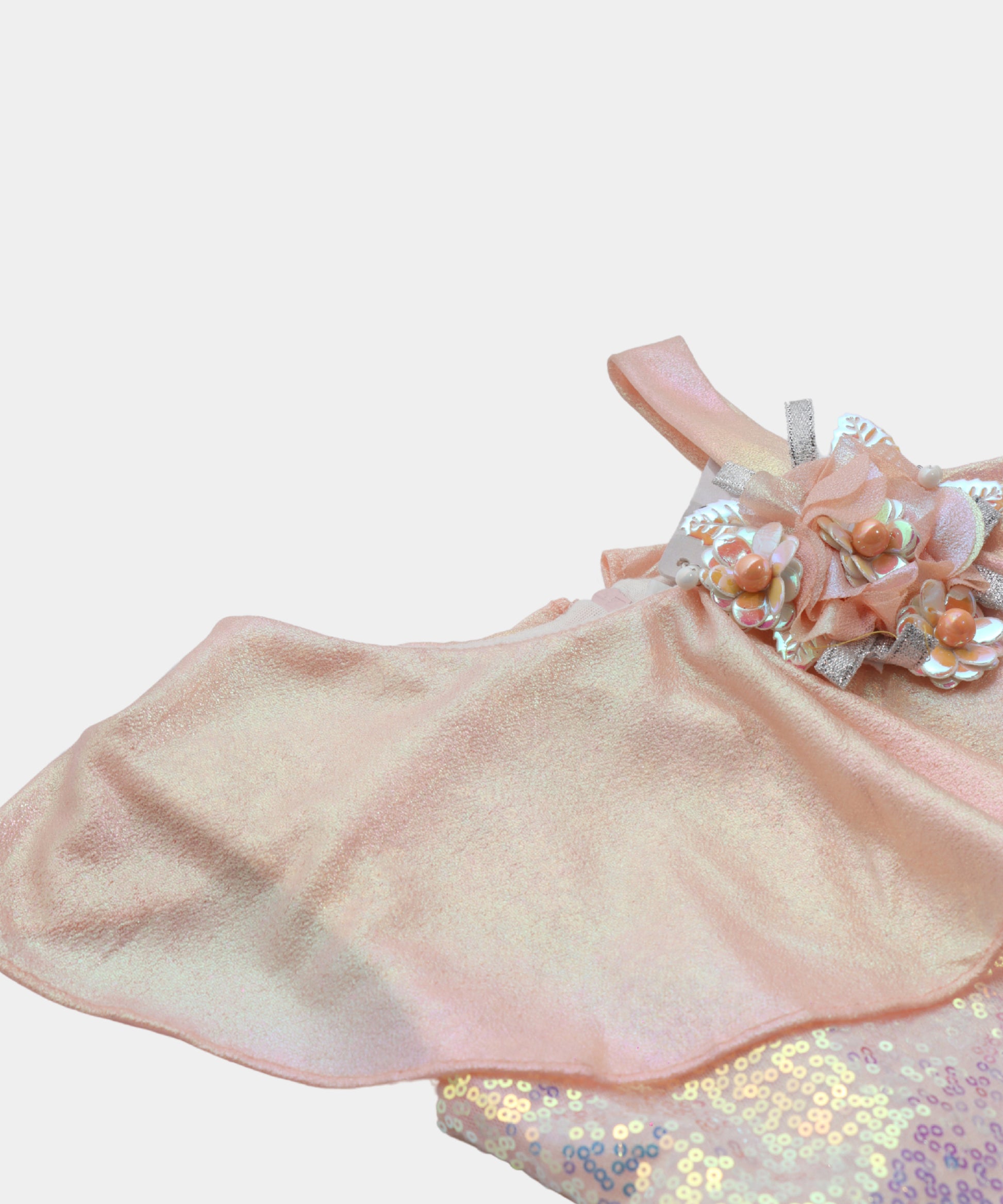 Let her shine with this stunning one-shoulder shimmer layered dress, featuring cascading ruffles and an eye-catching sequin bodice. Accented with a floral embellishment at the neckline, this dress is ideal for special occasions like birthdays, parties, and formal events. Its stylish asymmetrical design offers a perfect blend of elegance and charm.