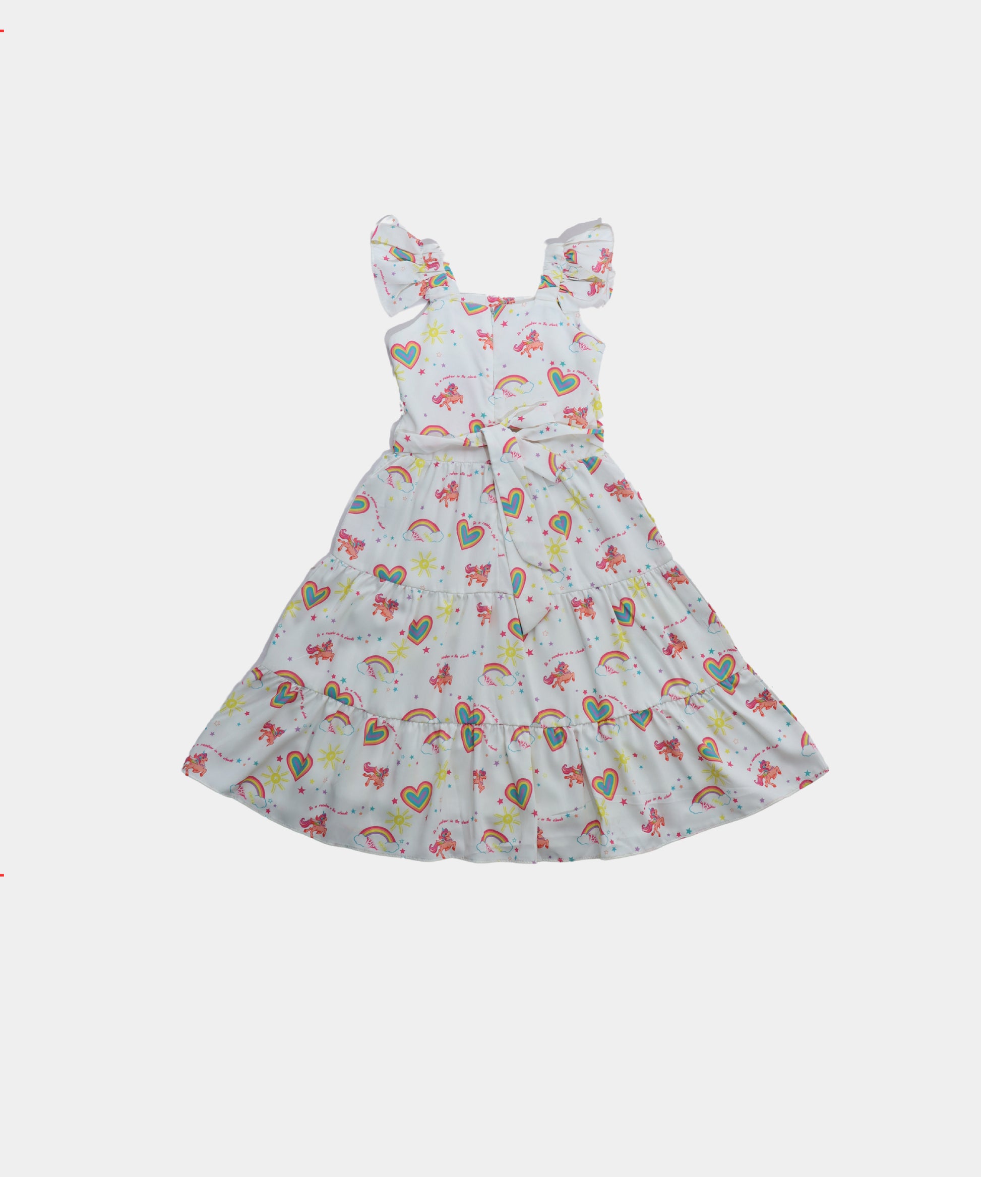 This charming white frock with colorful unicorn, rainbow, and heart prints is a magical pick for any little girl. Soft, flared, and finished with cute tie-up sleeves for extra style.